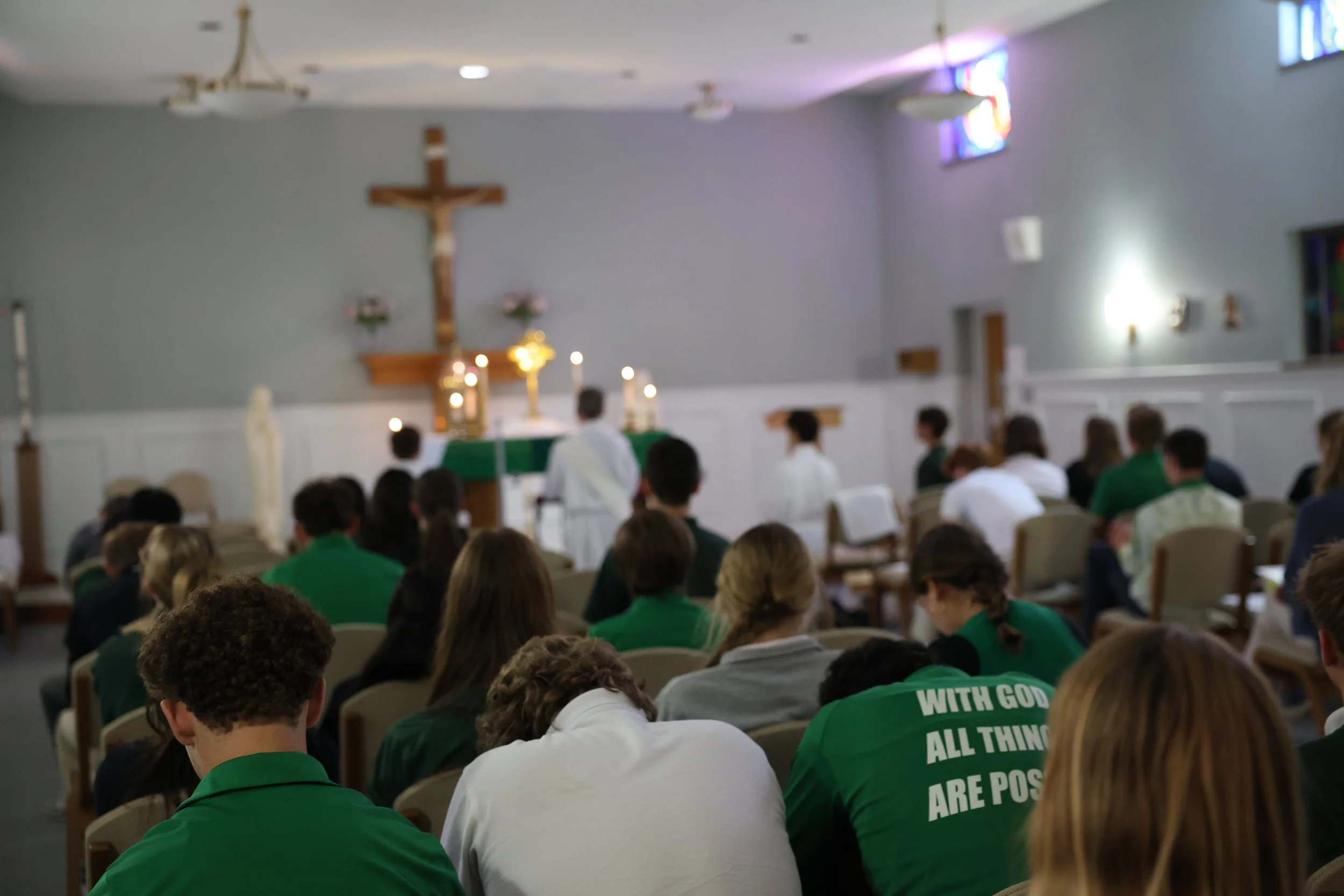 At Mass, we listen to God’s Word proclaimed in Sacred Scripture, offer our prayers as a community, and are strengthened by Christ to live as His disciples in the world. Because the Eucharist is the source and summit of our faith, we strongly encourage all students and families to participate in Mass every Sunday at their home parish.